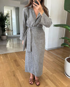 La robe a une coupe droite légèrement cintrée grâce à la ceinture à nouer. Le mannequin sur la photo porte une taille M, pèse environ 62 kg et mesure 170 cm.