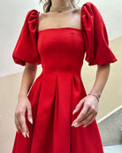 Cette robe rouge au style princesse séduit par sa coupe structurée et ses manches bouffantes dramatiques.