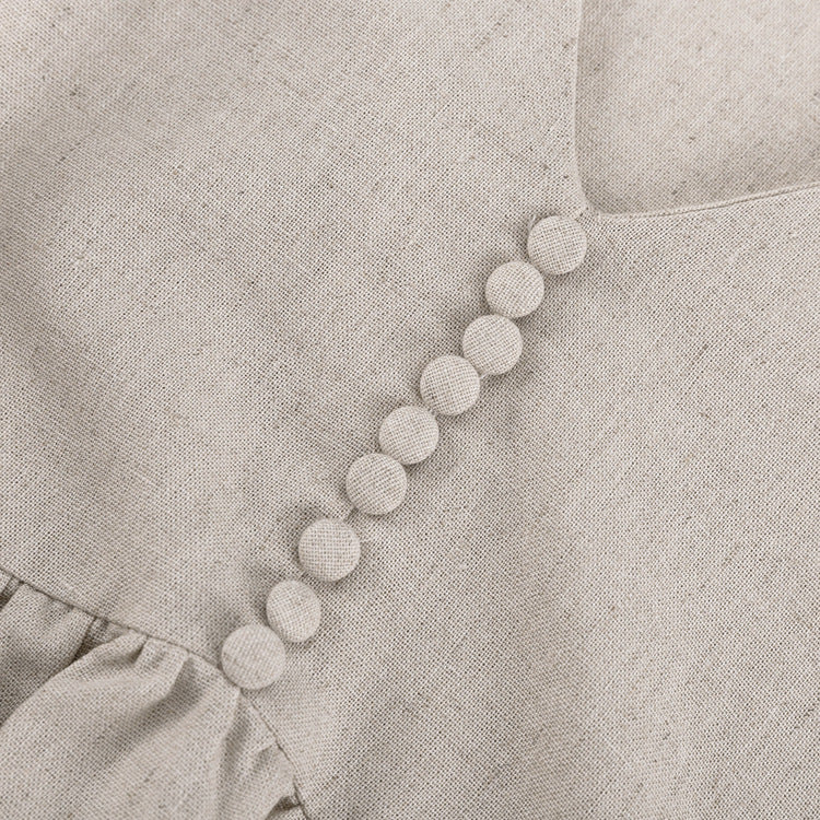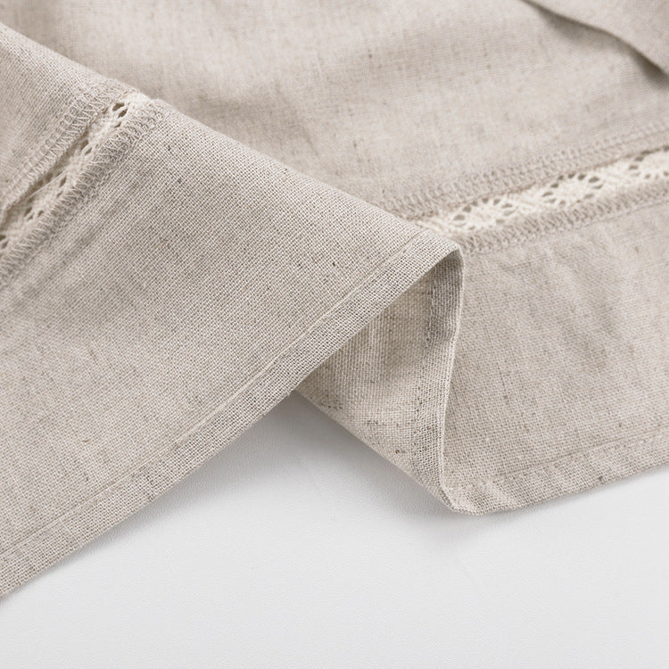 Cette robe courte en lin naturel séduit par son volume délicat, ses manches bouffantes et ses détails en dentelle raffinés.