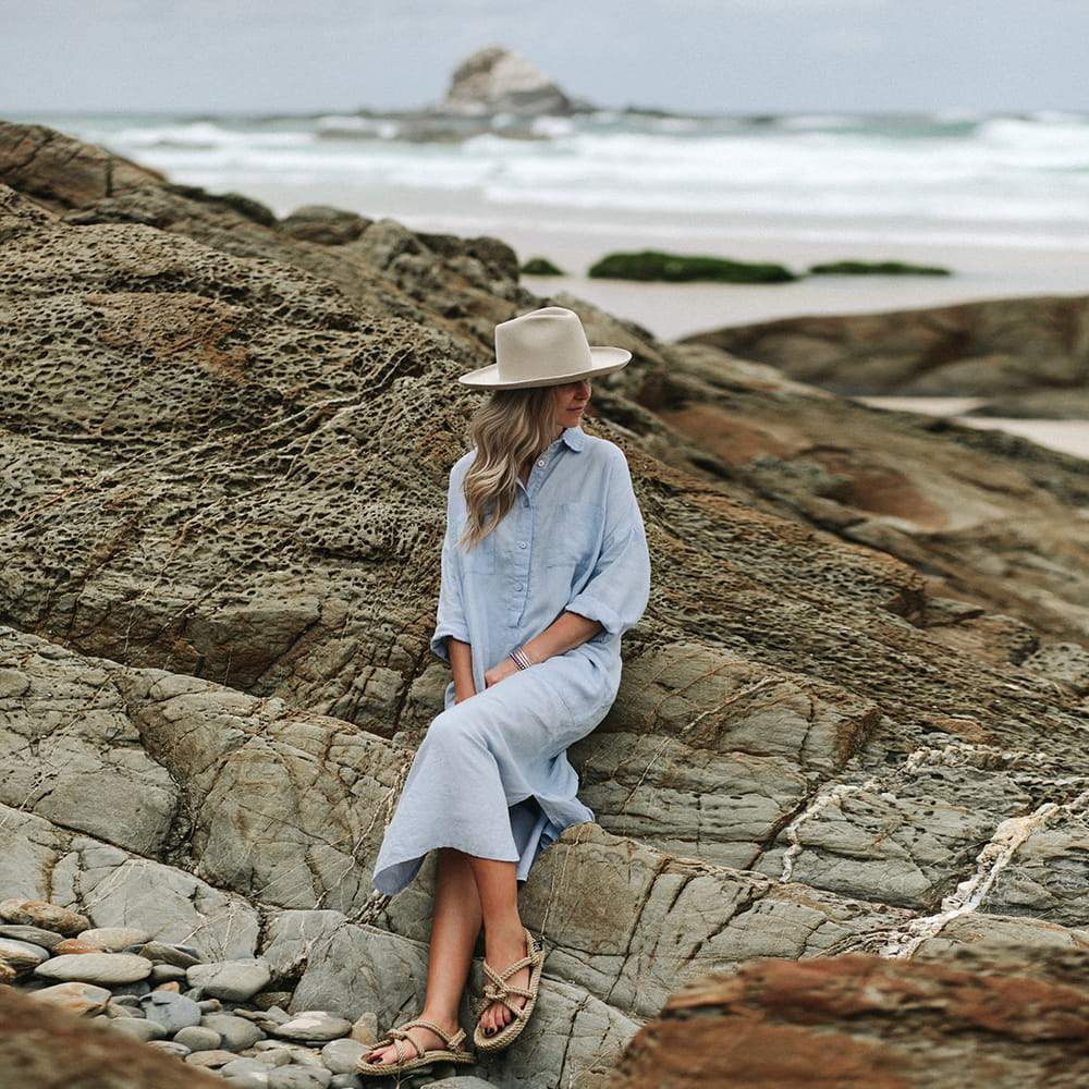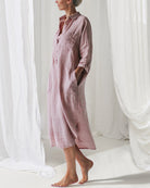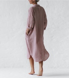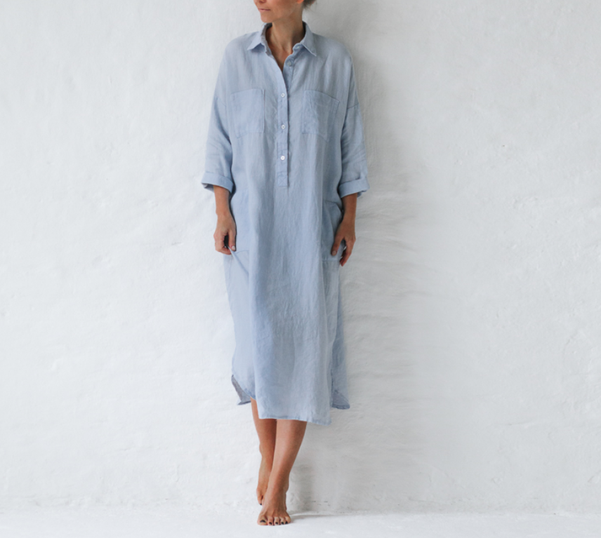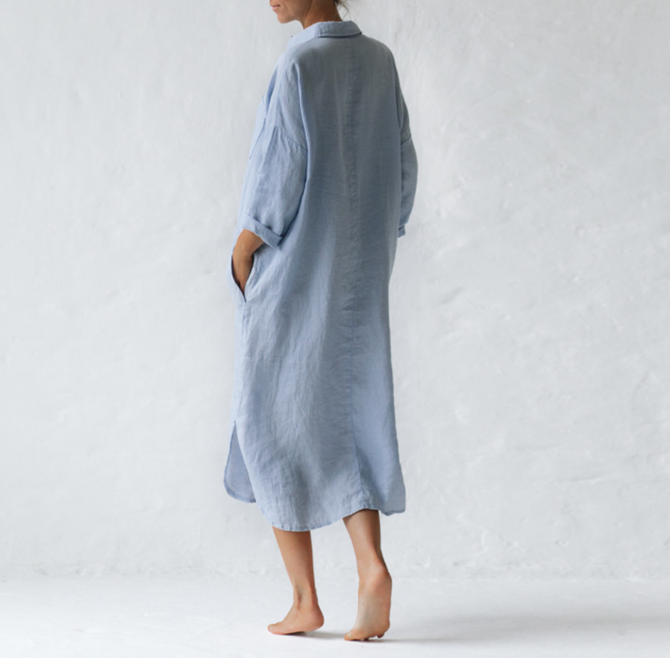 Cette robe légère en lin allie élégance minimaliste et confort absolu.