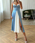 Cette robe bicolore beige et blanche au style bustier revisité attire tous les regards avec sa coupe structurée et sa fente séduisante.