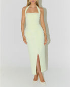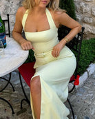 Son encolure droite et sa bretelle unique ajoutent une touche originale, tandis que la fente sur le devant lui donne une allure sensuelle mais raffinée.