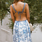 Cette robe longue séduit par son imprimé graphique bleu et blanc et ses découpes flatteuses qui mettent subtilement la silhouette en valeur.