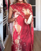 Cette robe longue au style drapé et imprimé abstrait en tons rouge et beige est une véritable pièce de créateur.