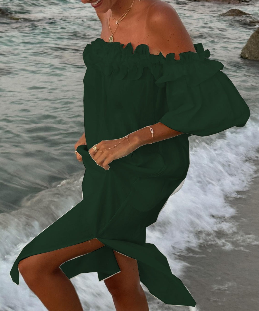 Cette robe longue  à épaules dénudées et volant délicat est une véritable ode à la féminité estivale.