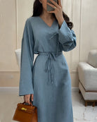 Cette robe longue bleu doux séduit par sa coupe minimaliste, ses manches longues évasées et sa taille ajustable.