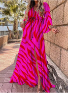 Cette robe longue à imprimé psychédélique mêle des teintes rose, orange, jaune et turquoise dans un style irrésistiblement bohème.