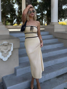 Cette robe bustier longue en tissu texturé crème est rehaussée de fines lignes noires et d’un lien délicat à nouer.