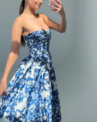 Cette robe bustier longue à imprimé floral bleu et blanc incarne la féminité et le raffinement dans toute leur splendeur.