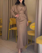 Cette robe longue beige à manches longues mise sur une coupe fluide et une ceinture intégrée qui souligne délicatement la taille.