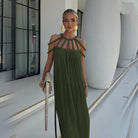 Cette robe longue au dos géométrique sublime chaque mouvement avec sa fluidité raffinée.