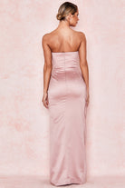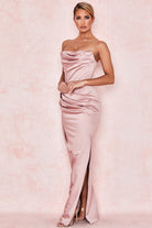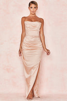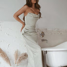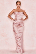 Cette robe longue bustier sublime la silhouette avec son drapé délicat et sa matière satinée.