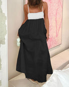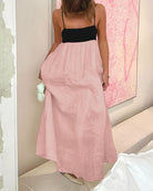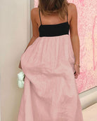 Cette robe bicolore à bretelles fines incarne la simplicité élégante avec une touche bohème.
