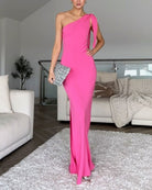 Cette robe longue fuchsia asymétrique incarne l'élégance moderne avec sa coupe ajustée et son nœud délicat à l'épaule.