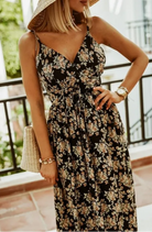 Son imprimé floral délicat sur fond noir sublime la silhouette avec douceur, tandis que la taille élastiquée souligne subtilement les courbes.