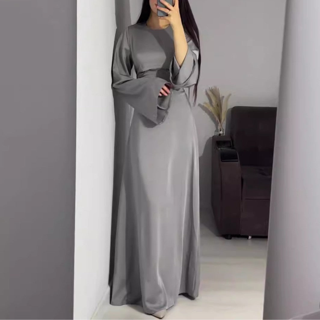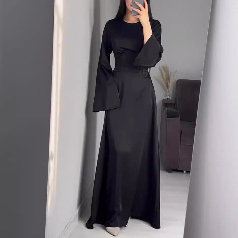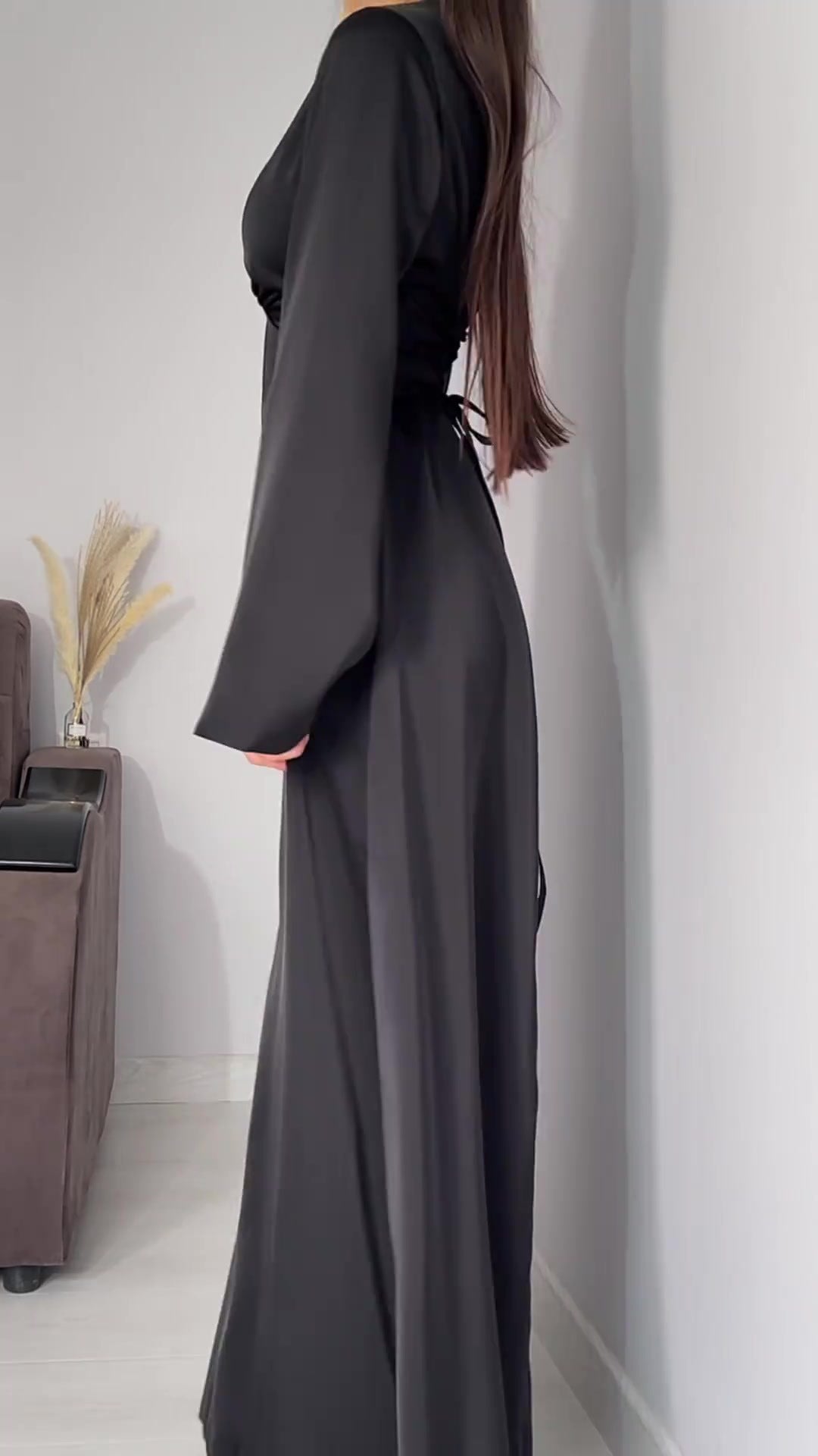 Cette robe à manches longues évasées incarne l’élégance pure avec sa coupe fluide et sa silhouette élancée.