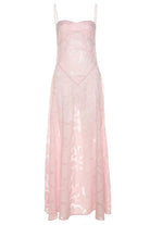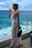 Cette robe longue nude à fines bretelles séduit par sa simplicité raffinée et son tissu texturé délicat.