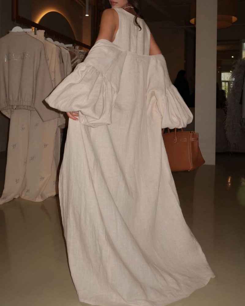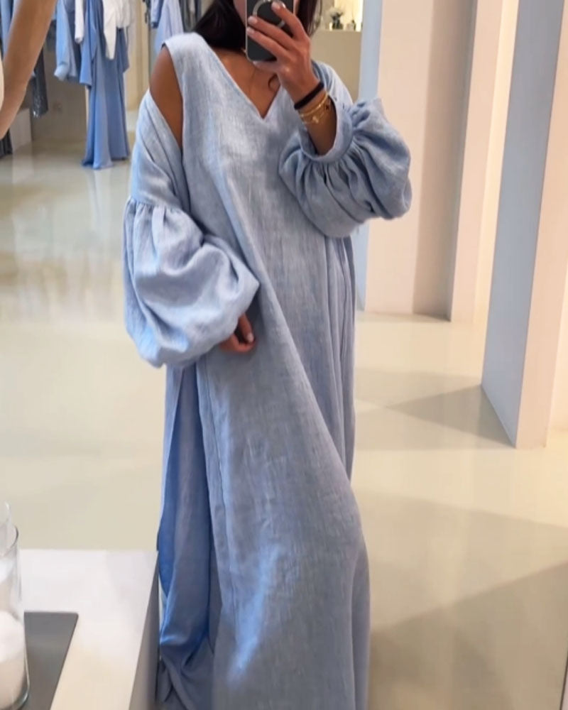 Cette robe longue bleu ciel avec manches bouffantes offre une allure bohème et fluide parfaite pour l'été.