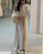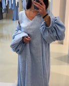 • Design : Robe longue à col en V avec manches longues bouffantes