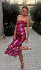 Brillez sous les projecteurs avec cette robe longue fuchsia entièrement ornée de paillettes.