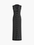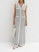 Cette robe longue sans manches   allie fraîcheur, confort et élégance avec son imprimé rayé noir sur fond blanc.