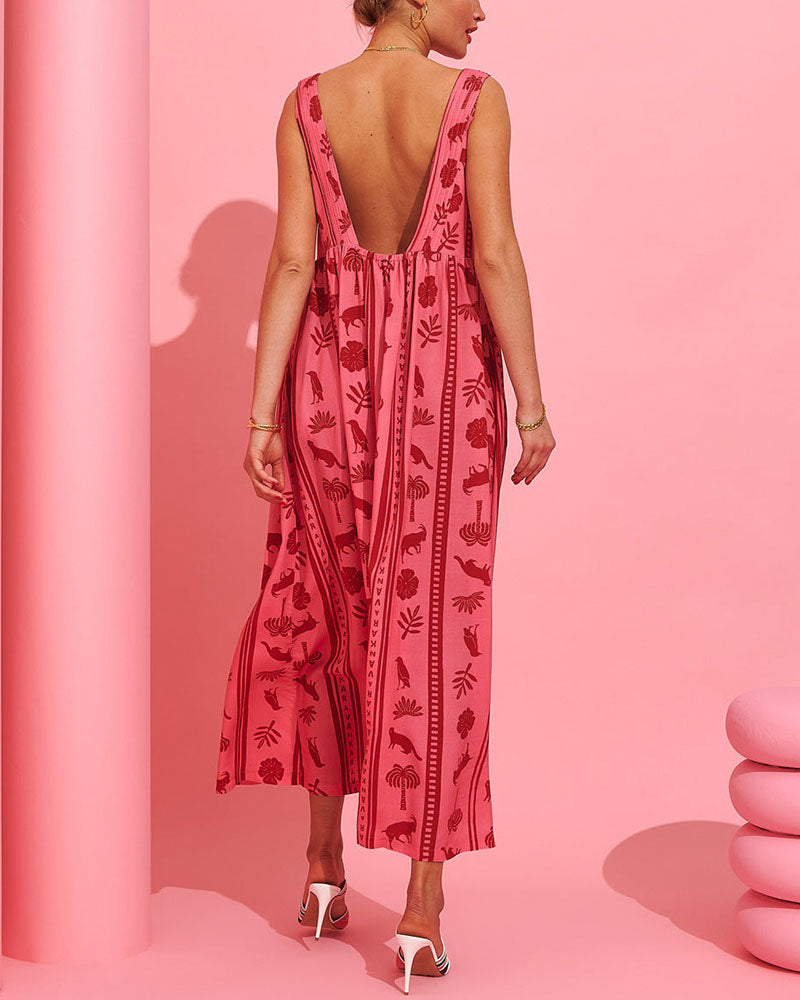 Cette robe longue dos nu, imprimée de motifs exotiques, est un clin d'œil à la liberté et au style.