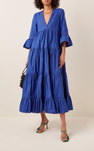 Cette robe longue bleu cobalt séduit par sa coupe aérienne à étages et ses manches à volants.