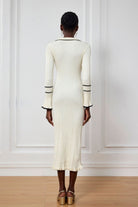 Cette robe longue en maille crème  combine style classique et détails raffinés.