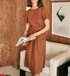 Cette robe midi en lin couleur terre cuite se distingue par son dos ouvert et sa fermeture boutonnée.