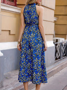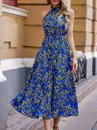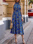 Cette robe midi fleurie à col montant allie raffinement et légèreté pour un look sophistiqué.
