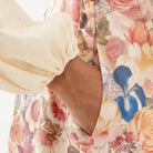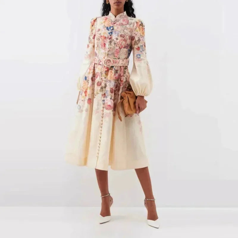 Cette robe midi à imprimé fleuri se distingue par son allure romantique et son style couture.