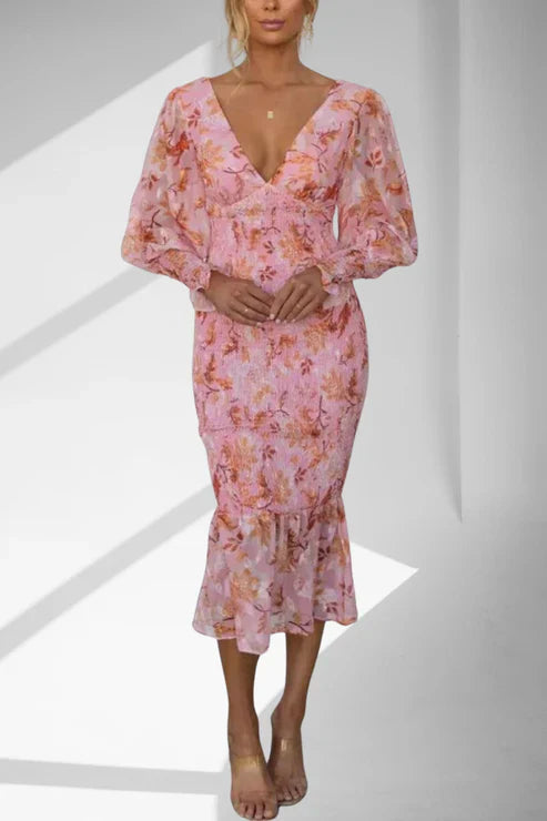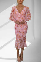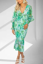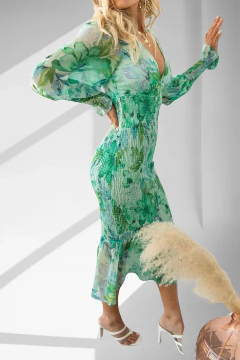 Robe Midi Fleurie | Vert & Turquoise | Manches Bouffantes et Coupe Volantée