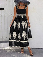 Son buste smocké offre un ajustement parfait tandis que la jupe évasée, ornée de motifs noirs contrastants, apporte un effet artisanal chic.