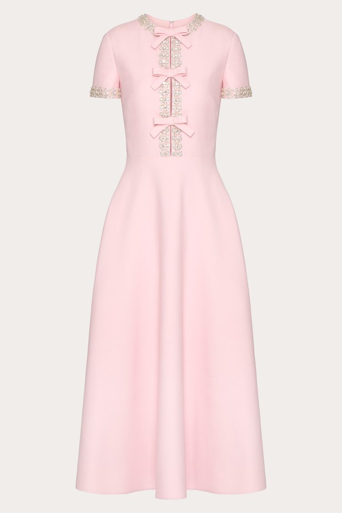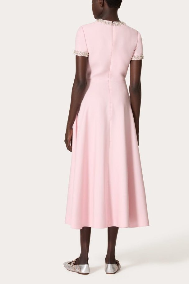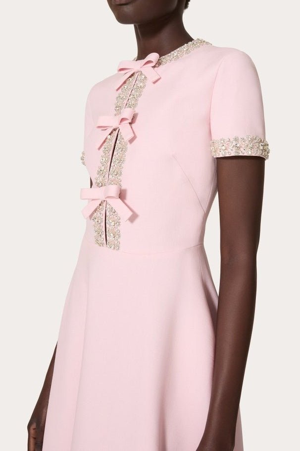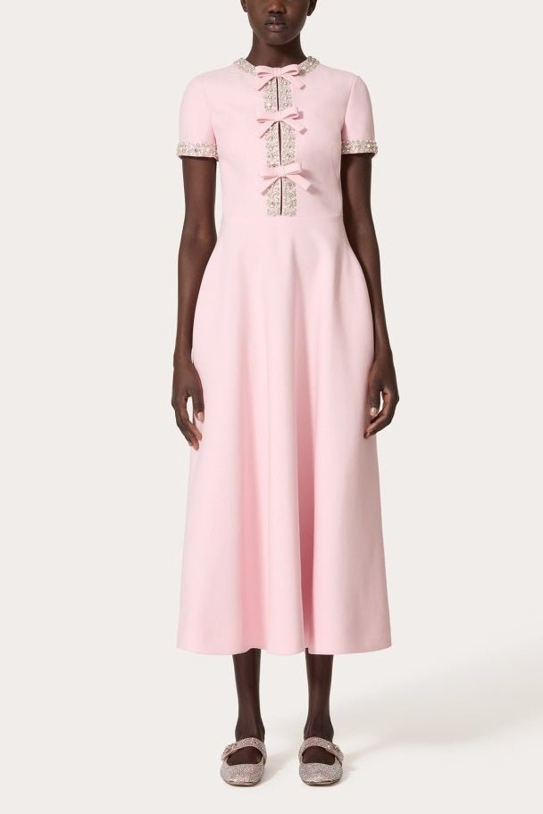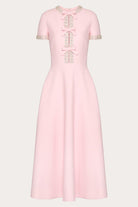 Robe Midi Rose Élégante | Nœuds Ornés & Détails Brillants | Coupe Structurée