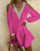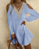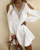 La robe a une coupe légèrement évasée avec des manches longues et épaules ouvertes.
