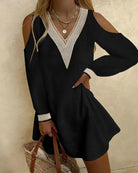 Cette robe noire à épaules dénudées et finitions en crochet est un parfait équilibre entre sophistication et décontraction.