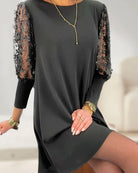 Cette robe noire droite avec manches brodées en tulle transparent est un véritable bijou de raffinement.