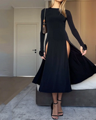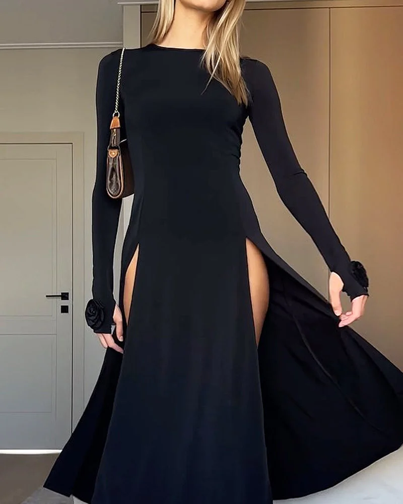Cette robe noire à manches longues est l'incarnation du glamour moderne avec ses fentes audacieuses et sa silhouette épurée.
