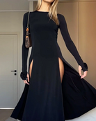 Robe Noire Longue | Fentes Hautes & Manches Longues | Élégance Moderne en Soirée