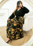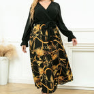 Cette robe portefeuille allie une élégante sobriété sur le haut à une jupe imprimée dorée audacieuse.
