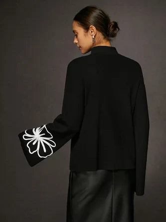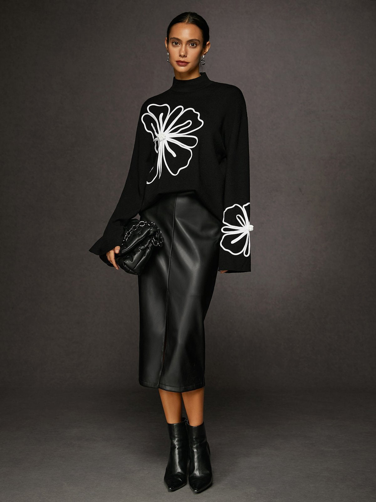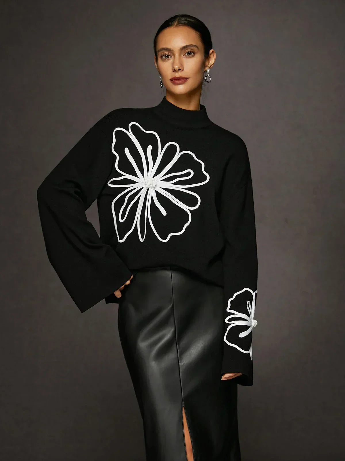 Ce pull noir à col montant orné de fleurs blanches stylisées combine minimalisme et expression artistique.