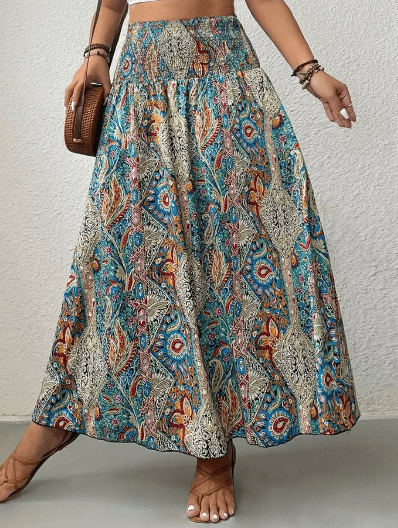Cette jupe longue à imprimé bohème se distingue par son volume dansant et sa taille haute flatteuse.