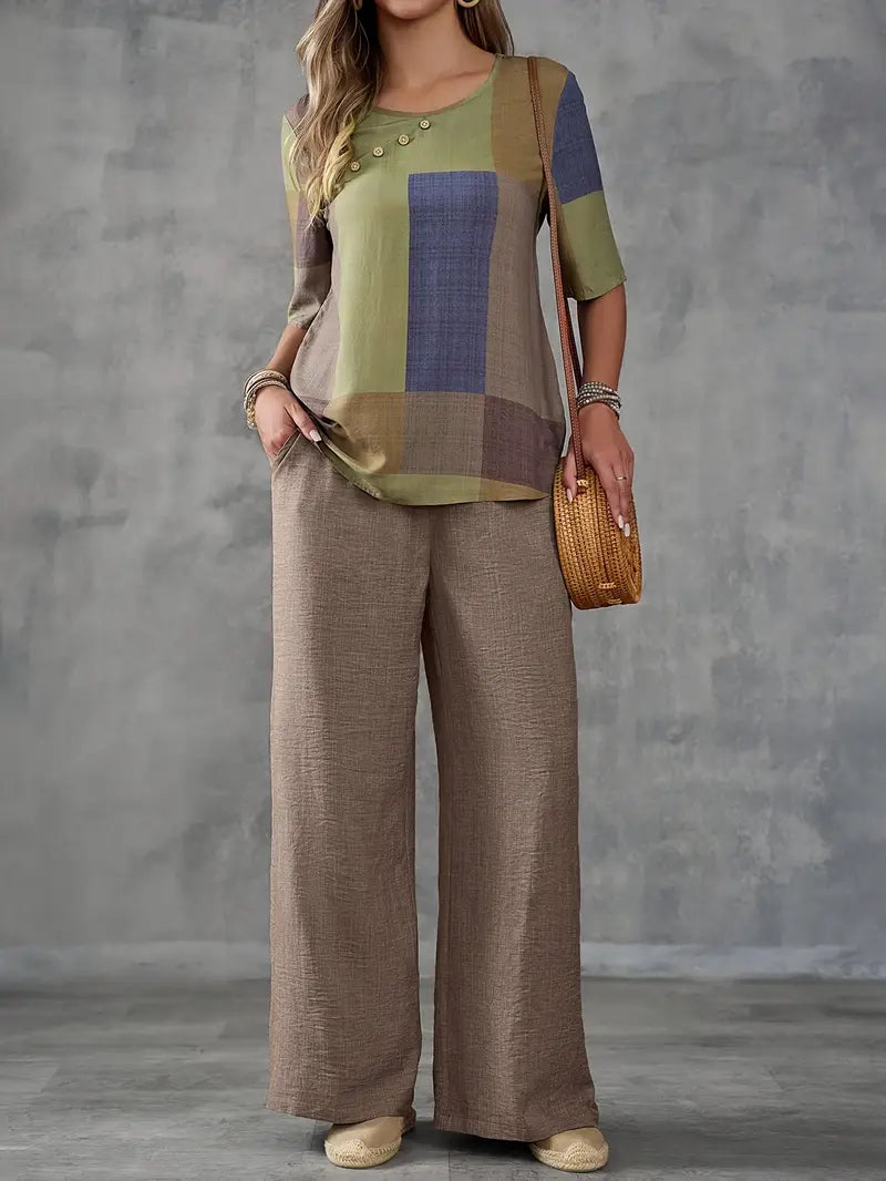 Cet ensemble associe un haut à manches trois-quarts à motif carreaux et un pantalon large pour un look casual élégant.