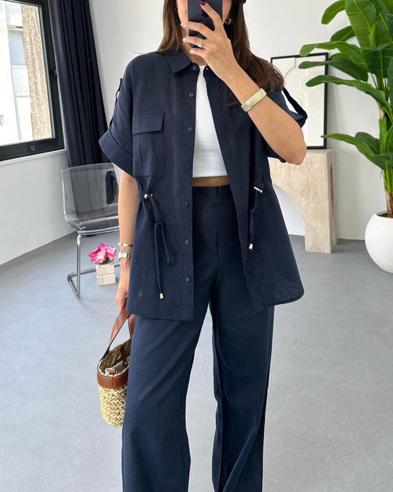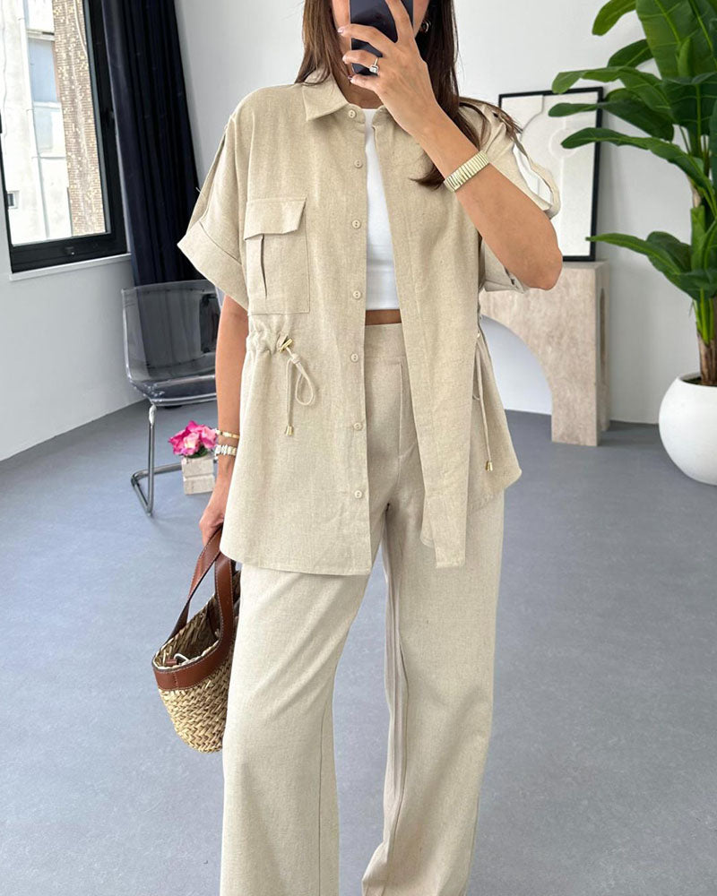 La chemise est ample avec une coupe ajustable à la taille, le pantalon est fluide avec taille haute confortable.