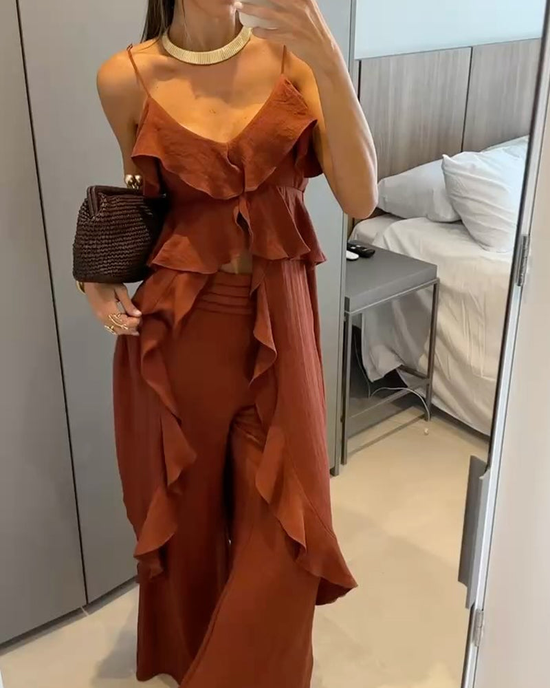 Cet ensemble deux pièces en tissu léger se compose d’un top à volants et d’un pantalon palazzo assorti pour une silhouette féminine et aérienne.
