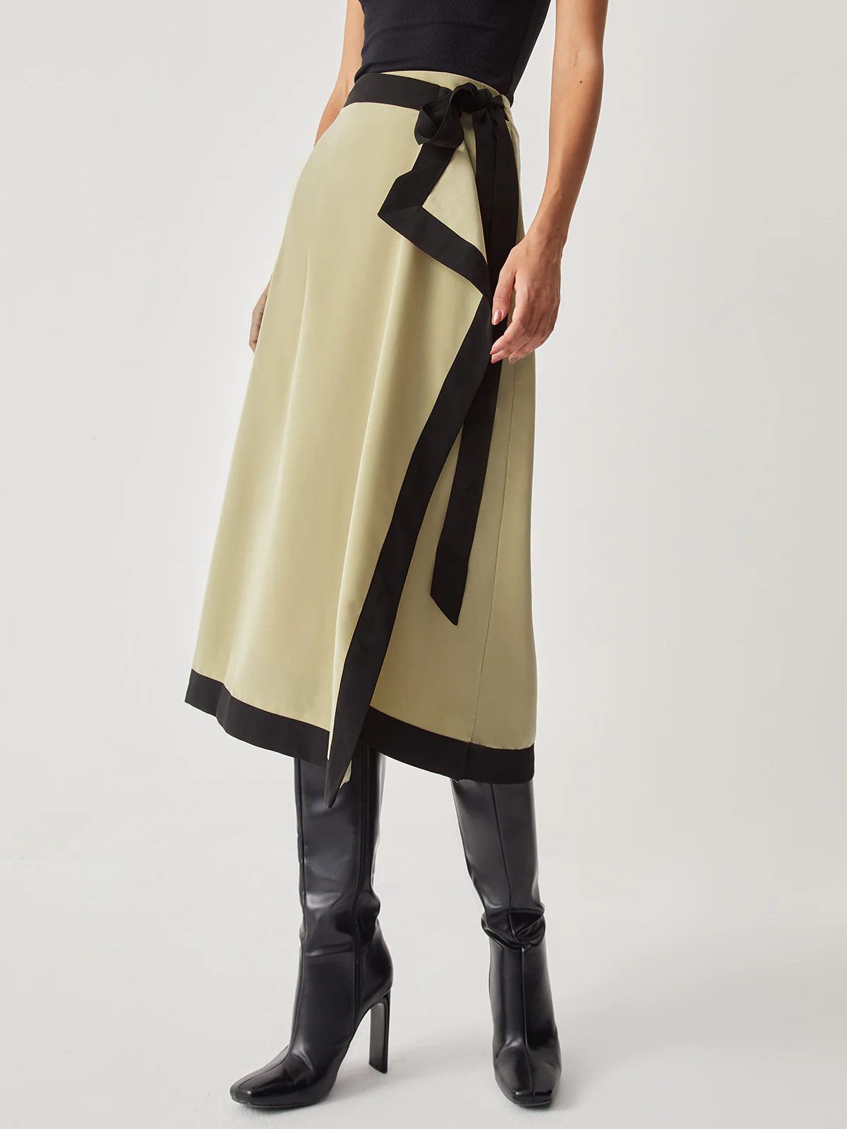 Cette jupe portefeuille bicolore en kaki et noir séduit par sa coupe structurée, son jeu de contrastes et son nœud délicat à la taille.