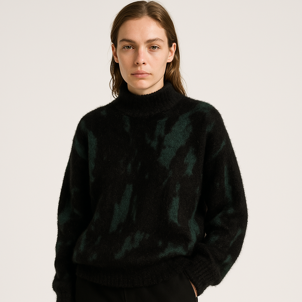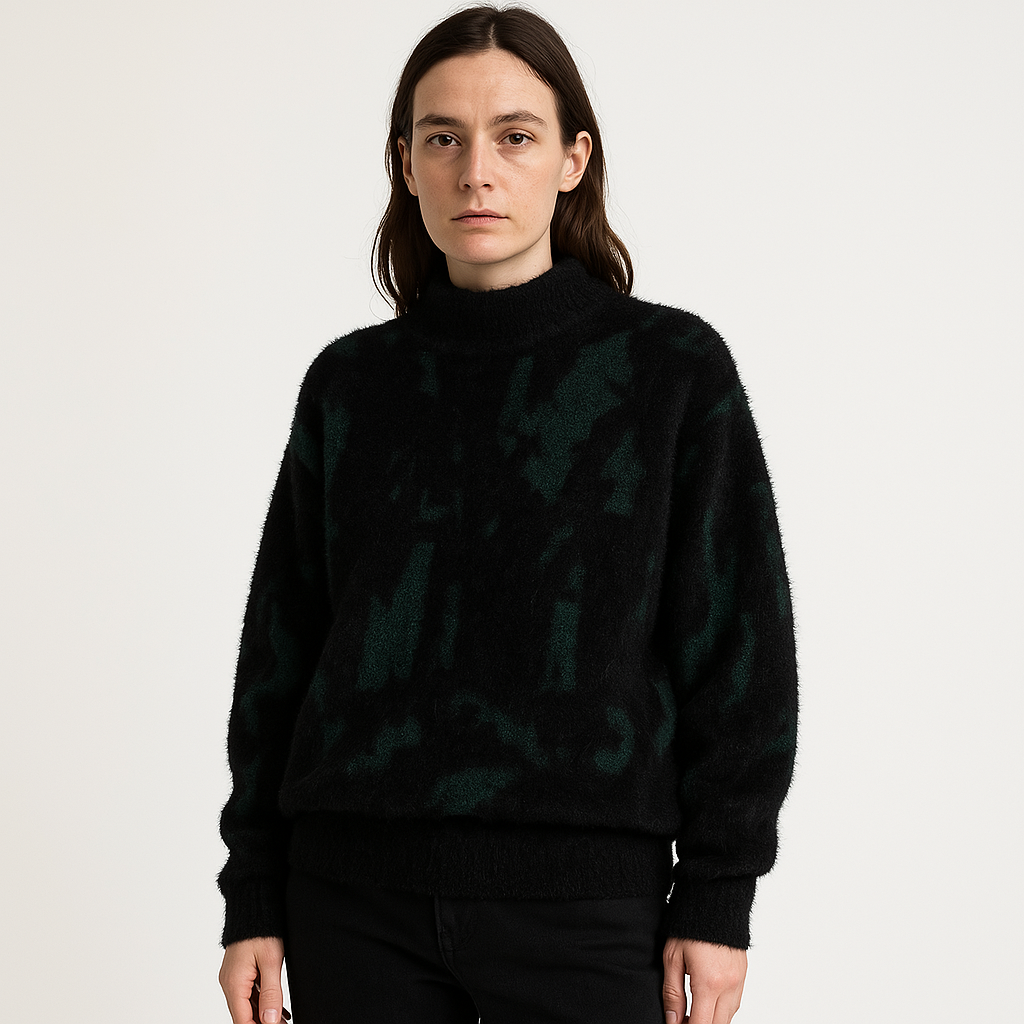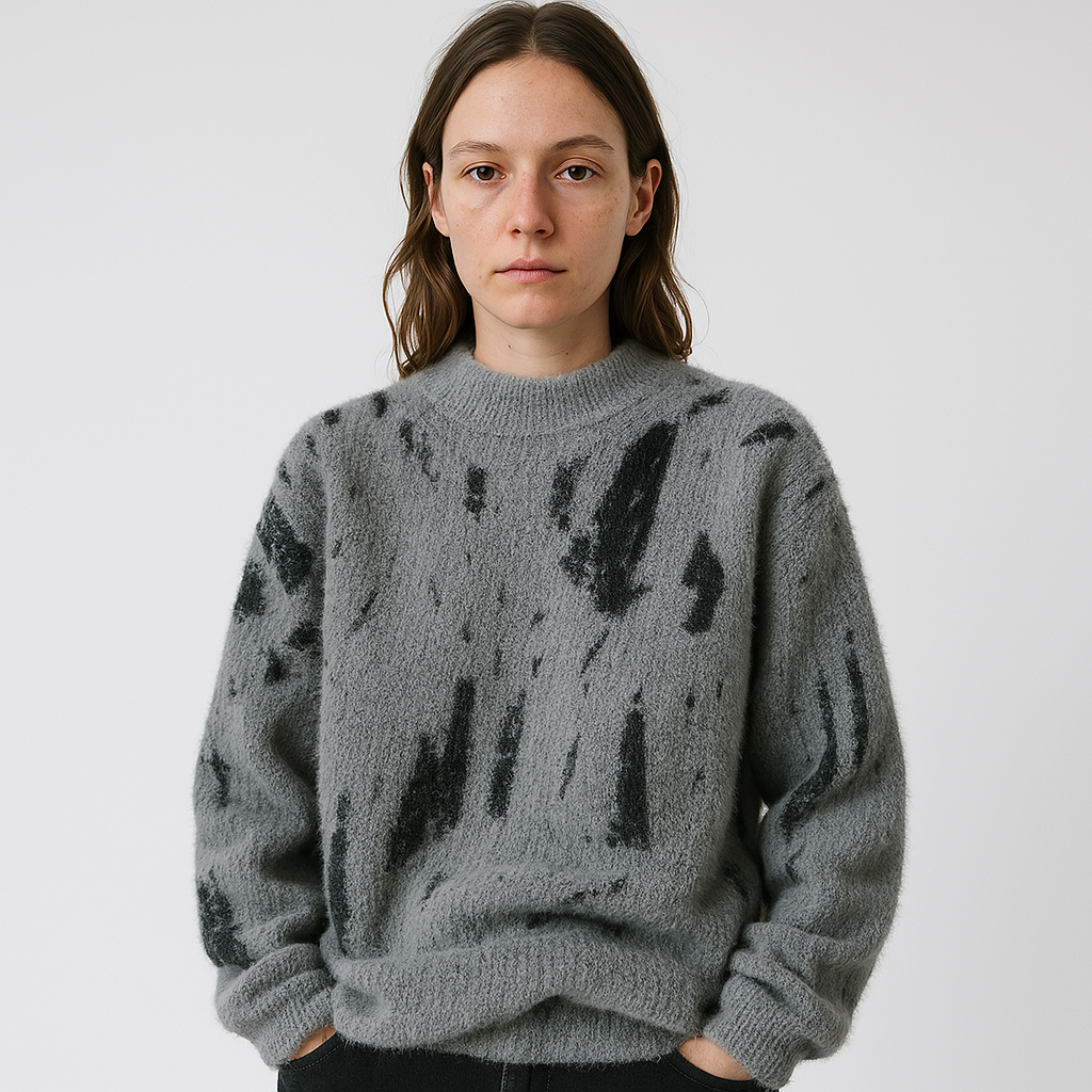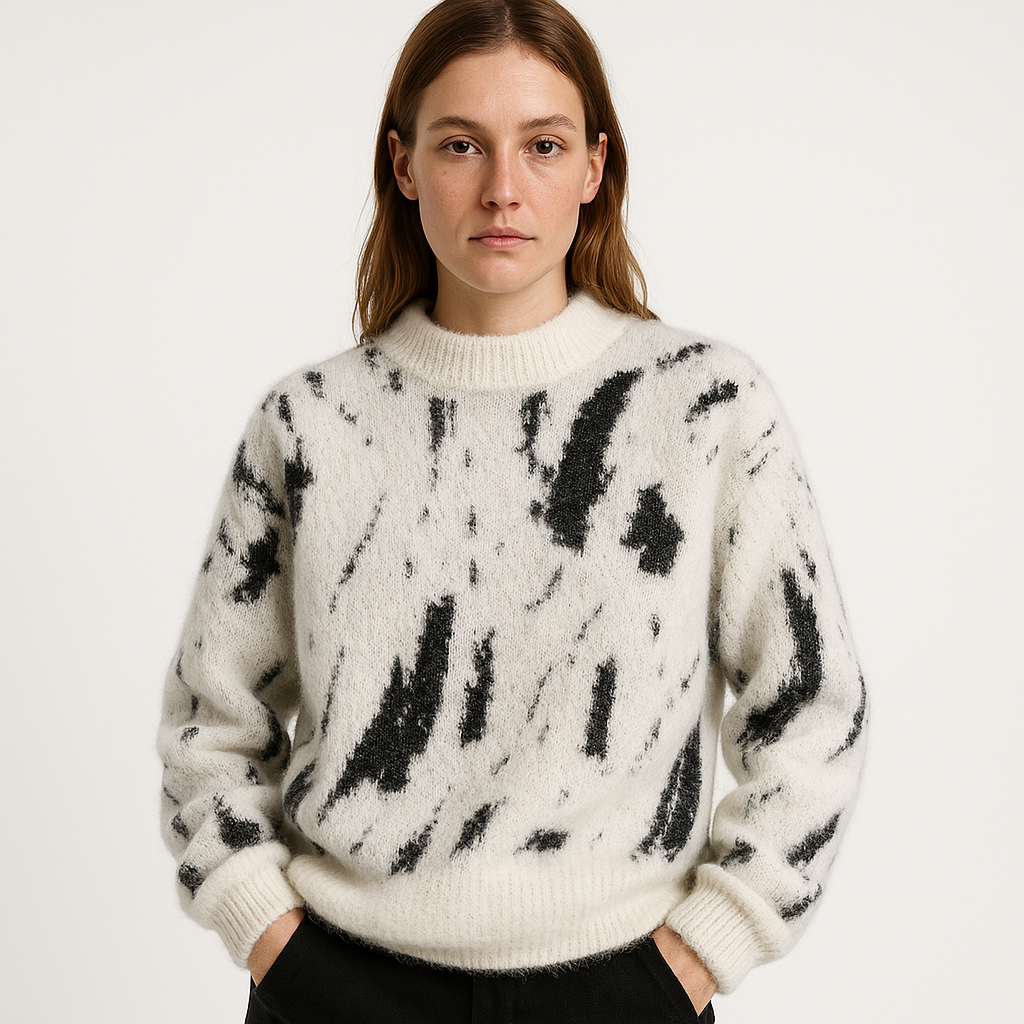 Ce pull en maille effet poils avec imprimé abstrait noir sur fond écru allie douceur extrême et allure contemporaine.