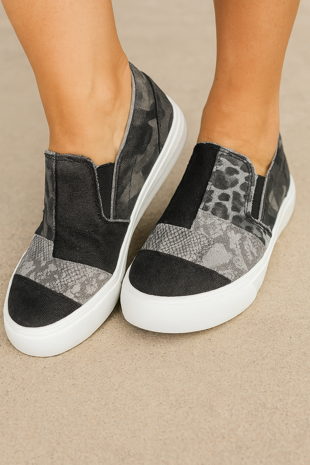 Ces baskets slip-on à imprimés mélangés (léopard, python et camouflage) sont parfaites pour un look urbain et audacieux.