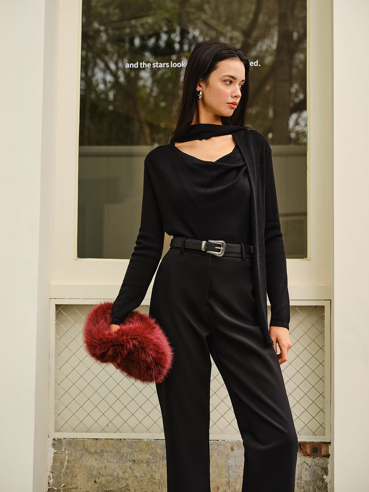 Ce top noir fluide à col drapé et détail tour de cou intégré apporte une touche moderne et raffinée à vos looks habillés.