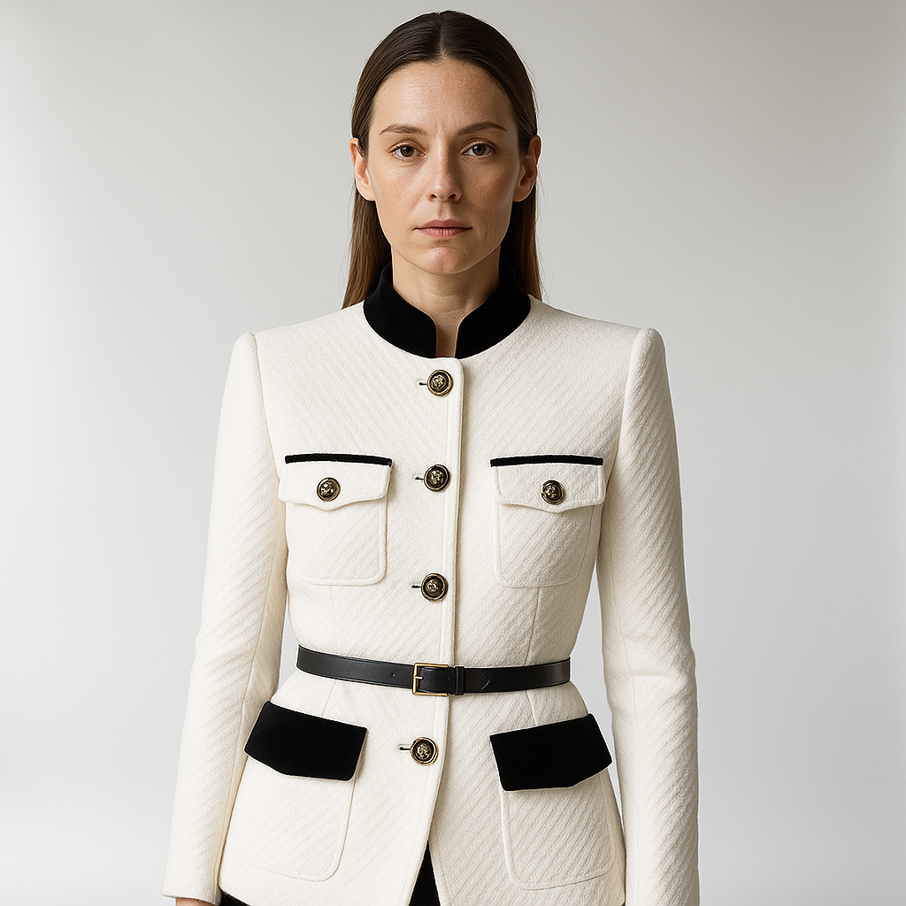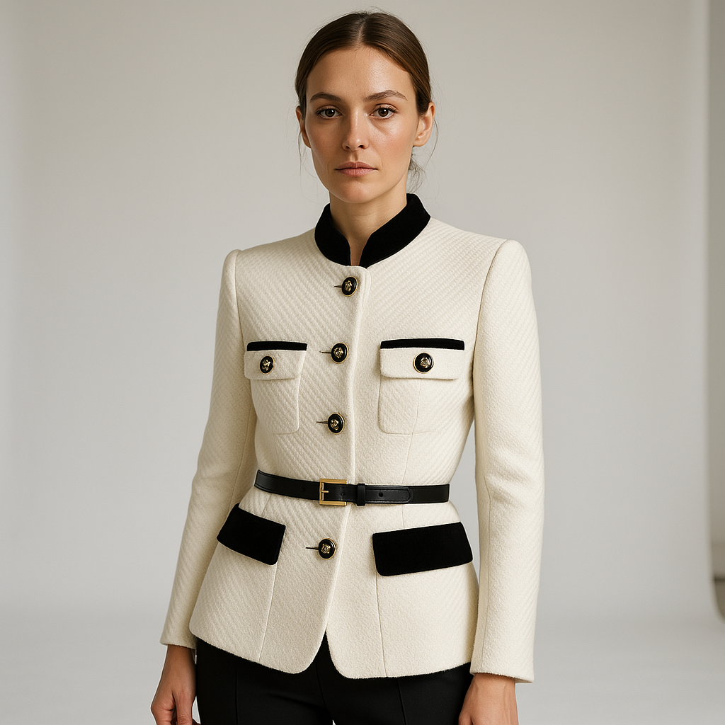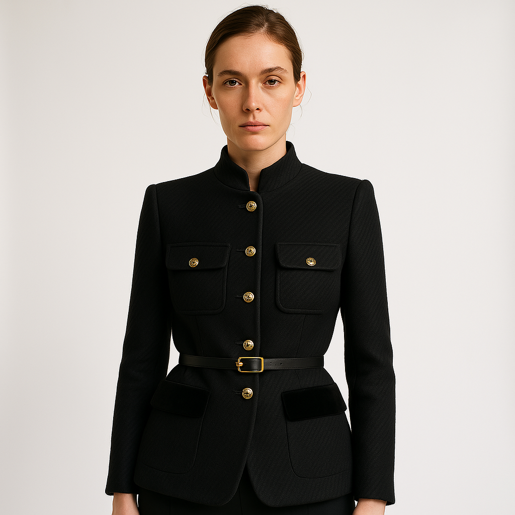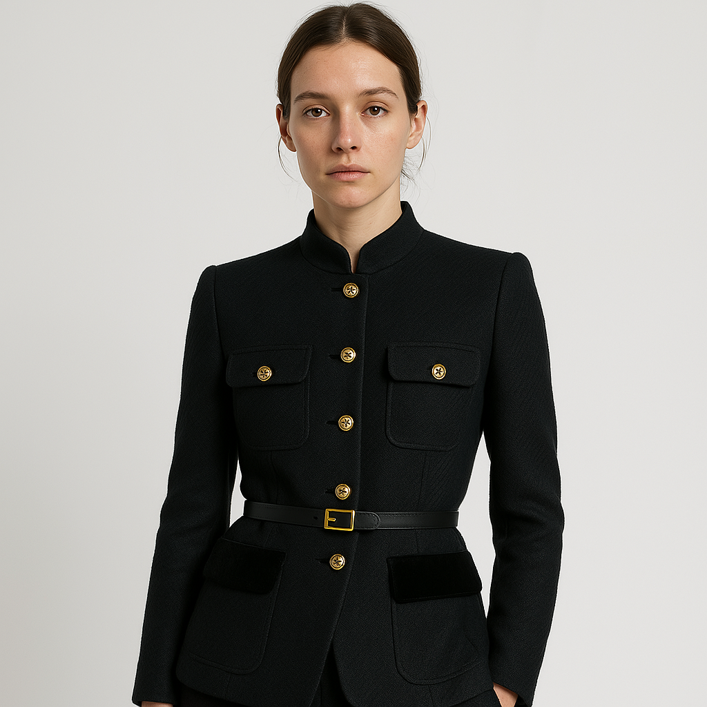 Veste Noire à Col Officier | Boutons Dorés & Ceinture | Élégance Structurée